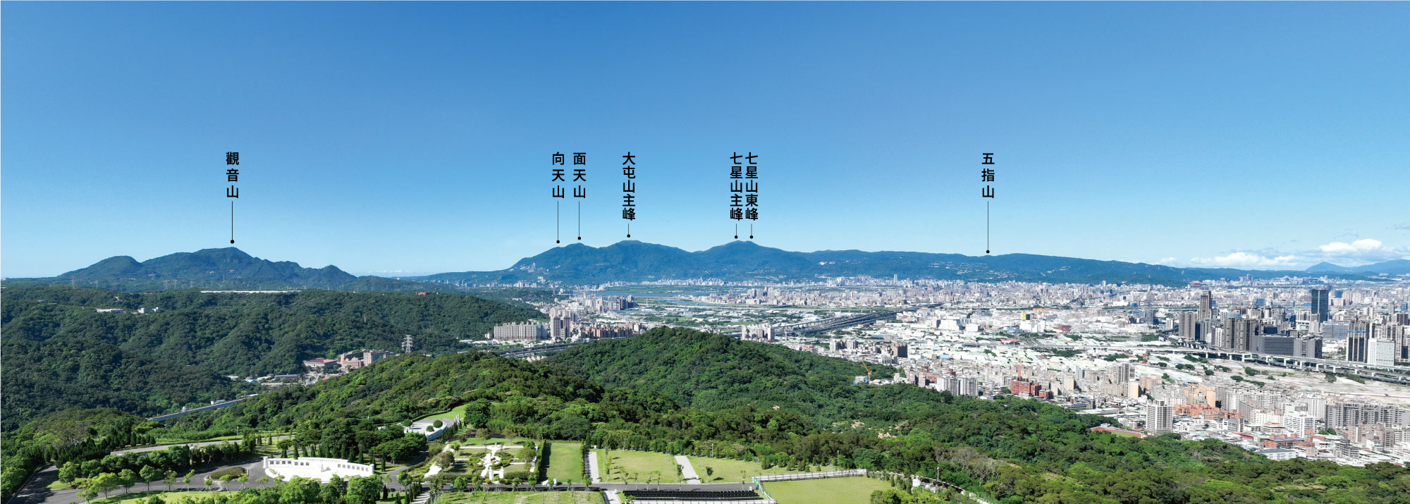 面向七星山、大屯山、紗帽山,地勢宏偉,可以居高俯瞰大台北盆地與淡水河,